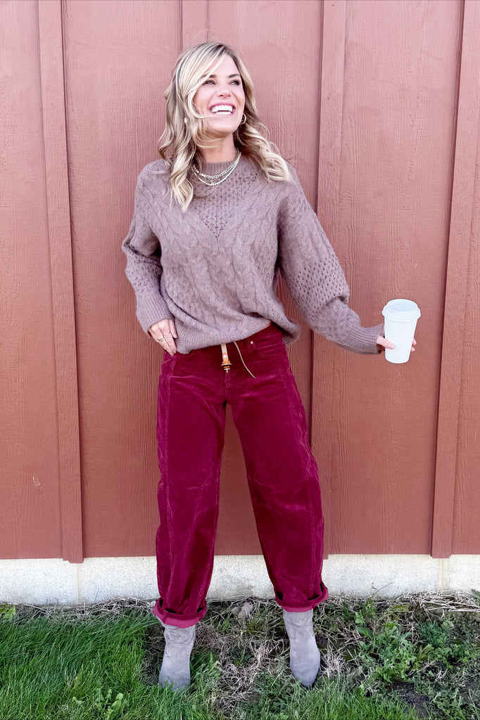 Gorgeous burgundy corduroy barrel style jeans. True to size fit with good stretch. 98.2% Cotton, 1.8% Spandex