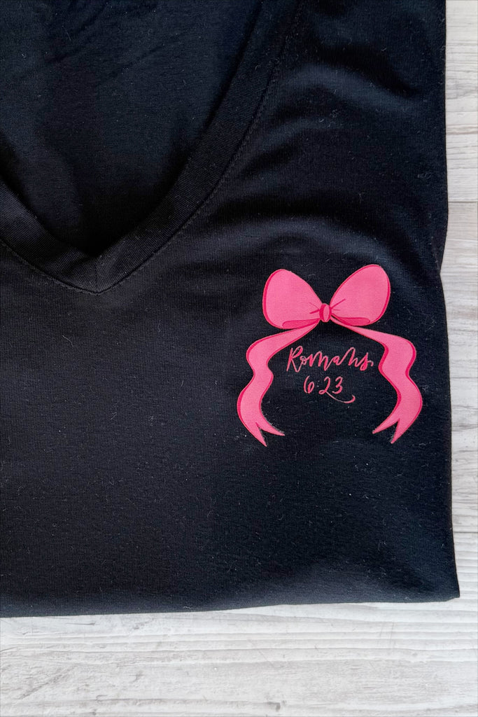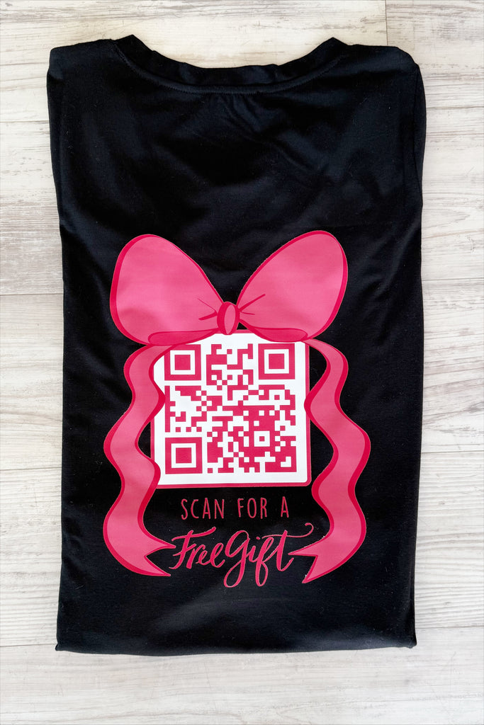 Give the gift of Salvation for free! The v-neck t-shirt is an adorable true to size fit with good room. The front has a small bow with Romans 6:23. The back has a large bow with a QR code that scans to a special video for whomever is viewing about the gift of salvation from our lord and savior, Jesus Christ.