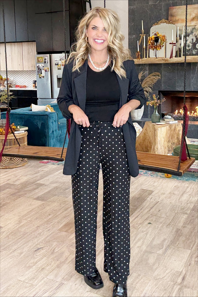 Incredibly soft black and white wide leg pants. Adjustable elastic waist and working drawstring. Has pockets 29" Inseam. True to size fit with great stretch. Size up for a more roomy fit. 92% Poylester 8% Spendex