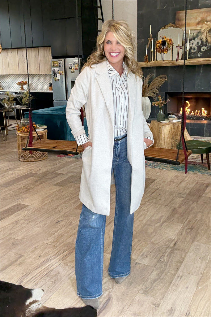 Gorgeous Ivory long collared felt coat. True to size fit with some stretch, size up if between sizes. 100% Polyester