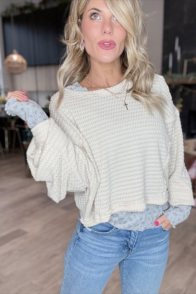 Adorable ivory oversized waffle top. Slight cropped style. True oversized fit with good room and stretch. 99% Polyester 1% Spandex
